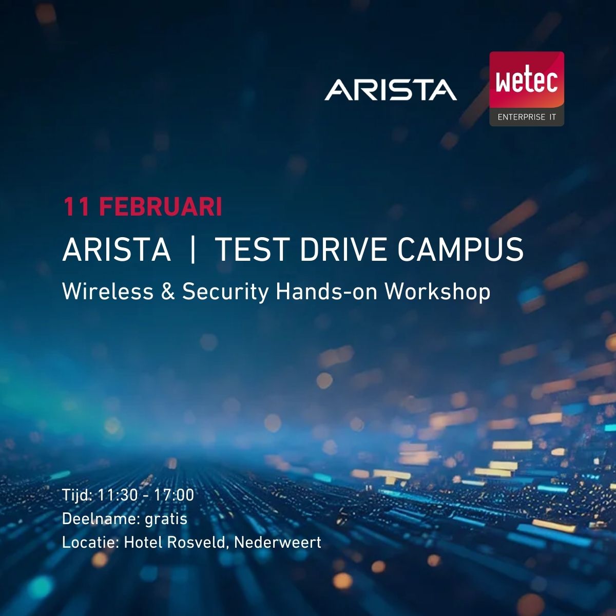 Op woensdag 11 februari 2026 organiseert Wetec Enterprise IT, in samenwerking met Arista, een Wireless & Security Hands-on Campus Workshop in Nederweert.
